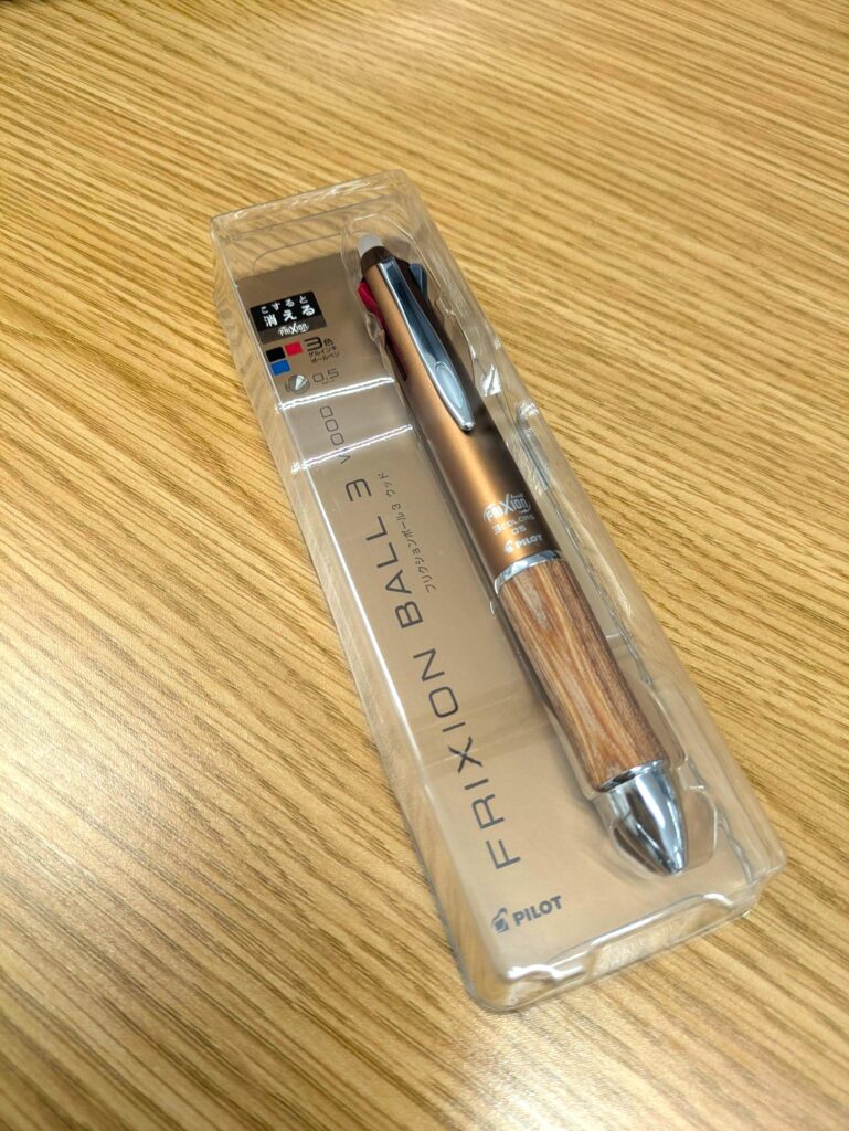 社員には記念としてフリクションが贈られました。木目で高級感があり、書き心地が良いです。